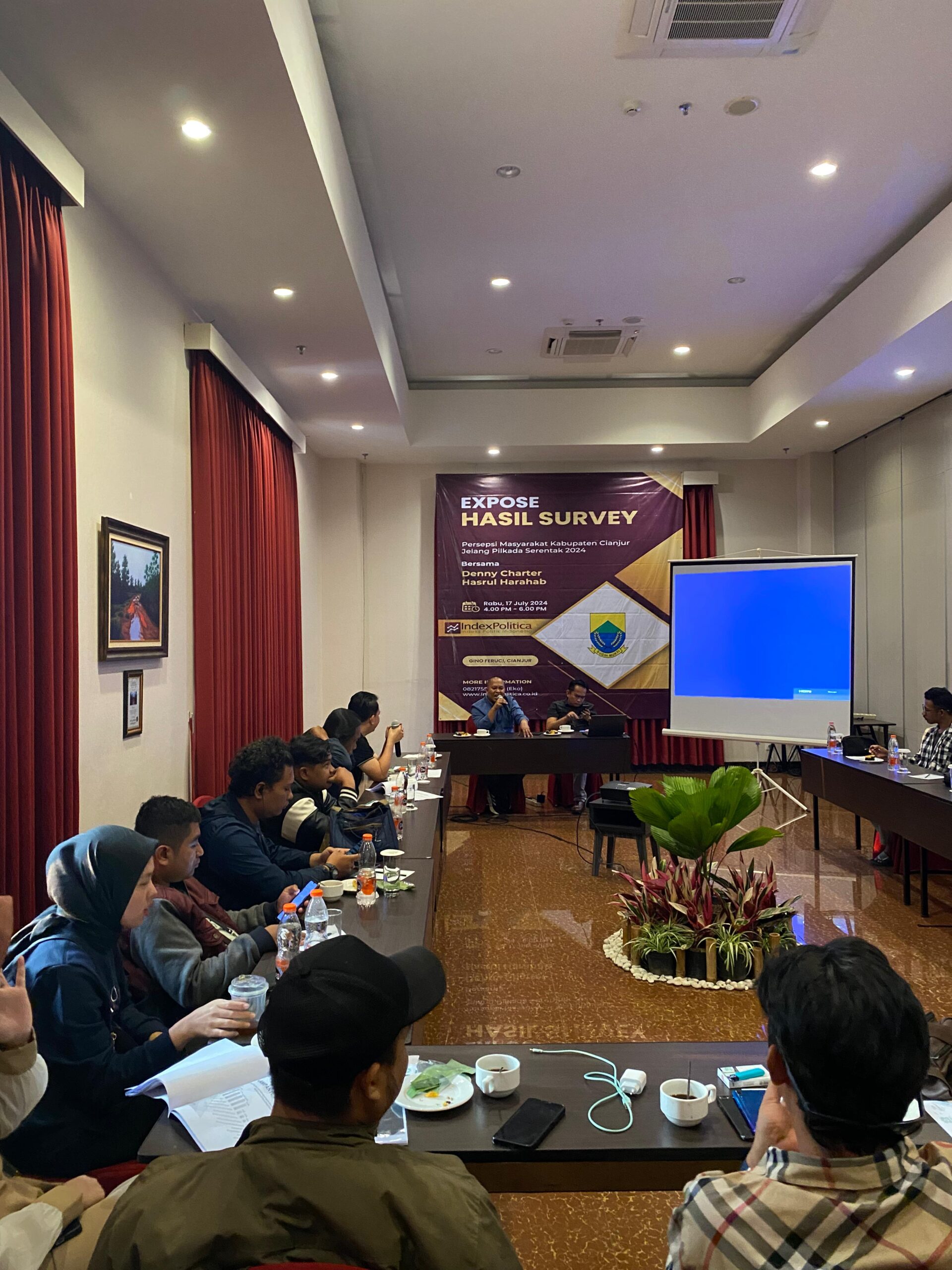 Direktur Eksekutif IndexPolitica, Hasrul Harahap, seusai ekspose hasil survei persepsi masyarakat Kabupaten Cianjur menjelang Pilkada 2024, Rabu (17/7)malam dihotel Gino Feruci Cianjur.