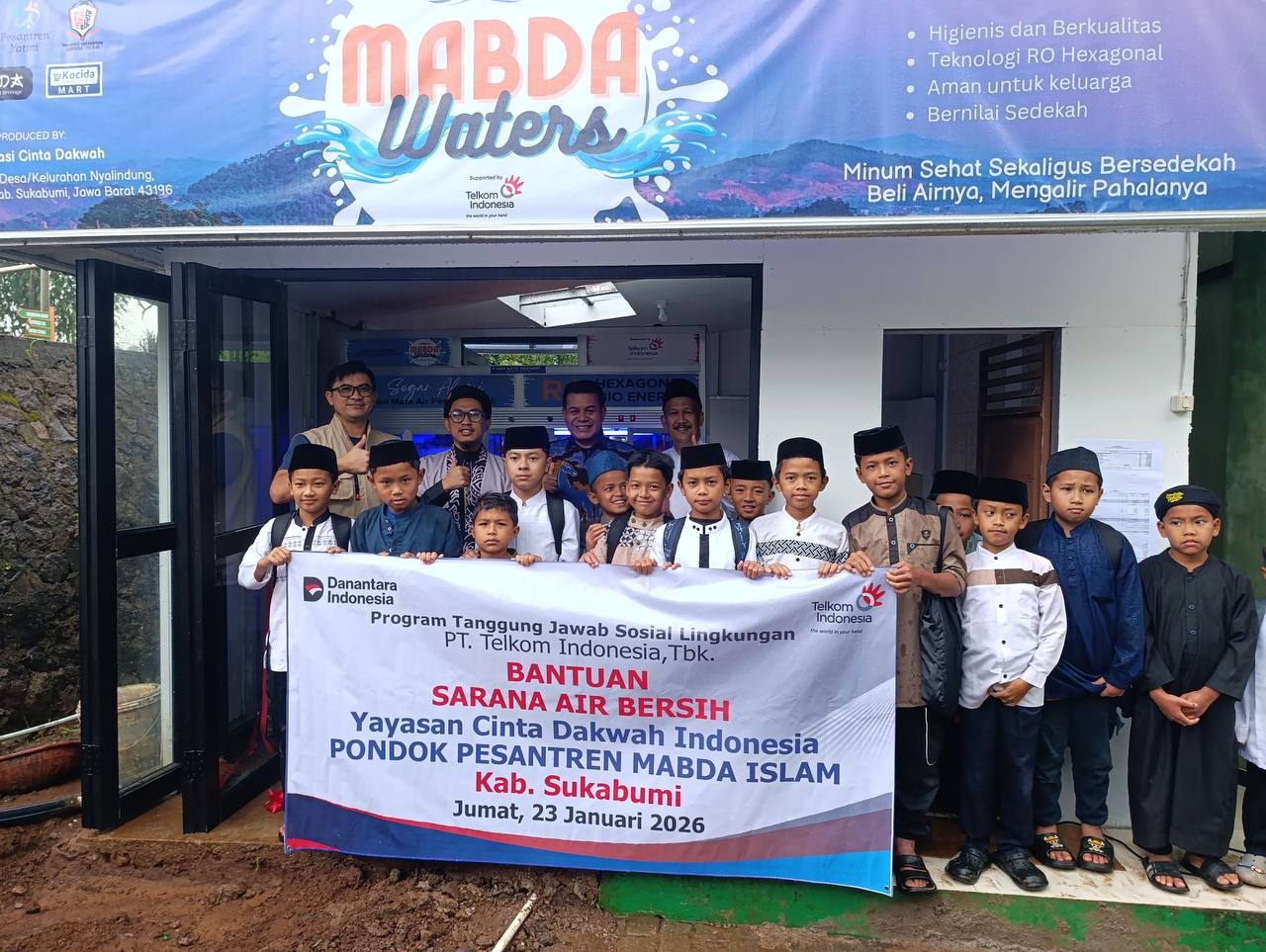 Bekasi – GM Witel Priangan Barat, Dode Suparman, menyerahkan bantuan sarana air bersih kepada Yayasan Cinta Dakwah Indonesia Pondok Pesantren Mabda Islam, yang berlokasi di Kecamatan Nyalindung, Kabupaten Sukabumi, Jumat (23/1).
